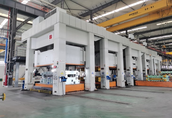 機身采用臥式框架拉桿(四柱)式結構,前梁、后梁通過四根拉桿(?柱)、支柱及緊固螺母預緊連接后成為?個剛性體,固定在底座上;動粱及擠壓筒位于前梁與后梁中間,擠壓筒內裝有加熱及保溫裝置;前梁內端面裝有二?位換模裝置;前梁或擠壓筒座上裝有壓余切除裝置;機身下部裝有自帶上料裝置。
