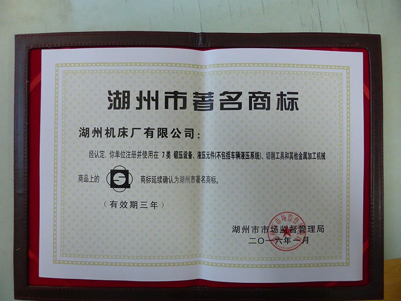 經(jīng)湖州市市場監(jiān)督管理局認(rèn)定,我公司液壓機(jī)產(chǎn)品商標(biāo)被延續(xù)確認(rèn)為湖州市著名商標(biāo)。有效期至2019年1月。